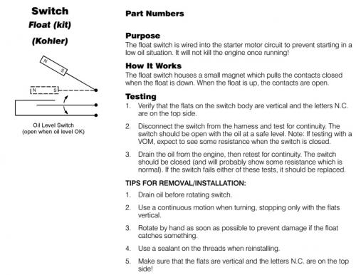 Low-oil switch used in the starter circuit for Kohler single cylinder engines starting with the 1986 models