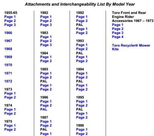 Tractor vs. Implement cross reference chart for models from 1955 - 2000 110 pages 513.43KB This chart lists the original attachment model The model that replaced the original model The model that was available when the list was made Often many models between the last two are not listed. You must go from year to year and follow the model numbers to see them all. For a complete list of models click on the magnifying glass in the Search box. Enter DNA in the Search box and select Files from the drop down menu. Two pages of 33 results will come up in random order. Find the attachment you are looking for and click on it. The DNA for that model of attachment will come up. Look for the model of your attachment in the DNA list. They are organized from earliest to latest. OR Search the Files using a model number you know will work. Look through the results for DNA in another file name for the same item. That will have the full list of models. STD for a model indicates that attachment was standard equipment that came on that model of tractor. Mistakes in the online attachment list @ Toro. The Attachment Interchange is correct but confusing and the source of the mistakes. 1970 *VS rear discharge mower deck 5-7362 is correct replaced by 5-0610 both CCW rotation 1971 rear discharge mower deck 5-0600 - CW spindle rotation fits long frame tractors only 1971 *CG-7 & 8 rear discharge mower deck should be model 5-7362 - CCW spindle rotation 1972 *CG-7 & 8 rear discharge mower deck should be model 5-0610 - CCW spindle rotation 1973 *VS rear discharge mower deck should be model 5-0611 - CCW spindle rotation 1970 *VS side discharge mower deck 5-2365 is correct replaced by 5-0700 both CCW rotation 1971 side discharge mower deck 5-0710 - CW spindle rotation fits long frame tractors only 1971 *CG-7 & 8 side discharge mower deck should be model 5-0700 - CCW spindle rotation 1972 *CG-7 & 8 side discharge mower deck should be model 5-0701 - CCW spindle rotation 1973 *VS side discharge mower deck should be model 5-0702 - CCW spindle rotation 1974 Replacement rear discharge mower deck for the model 5-0622 (side discharge) is wrong - should be 65-36XR01 *Models using a vertical engine crankshaftFree