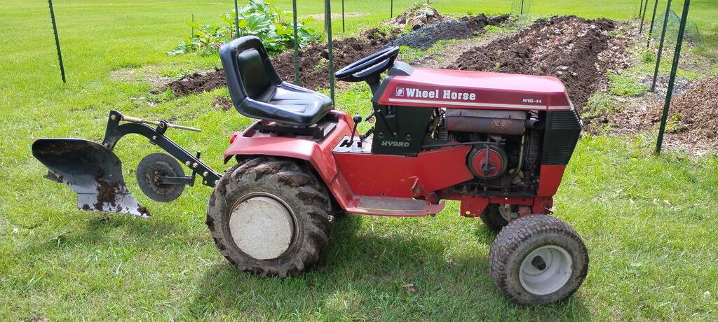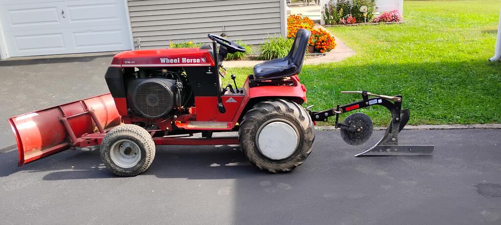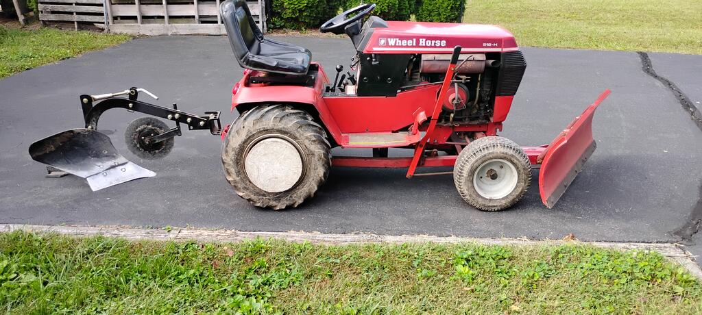 Wheel Horse 516 with 8 speed hi/low trans. Has 42" snow/dirt blade and Brinly garden plow. Brinly garden plow like new. Recent new ignition module and rear bar tread tires. Always garage stored and mainly used to plow garden and other small chores. No longer have garden and other WH to plow snow.