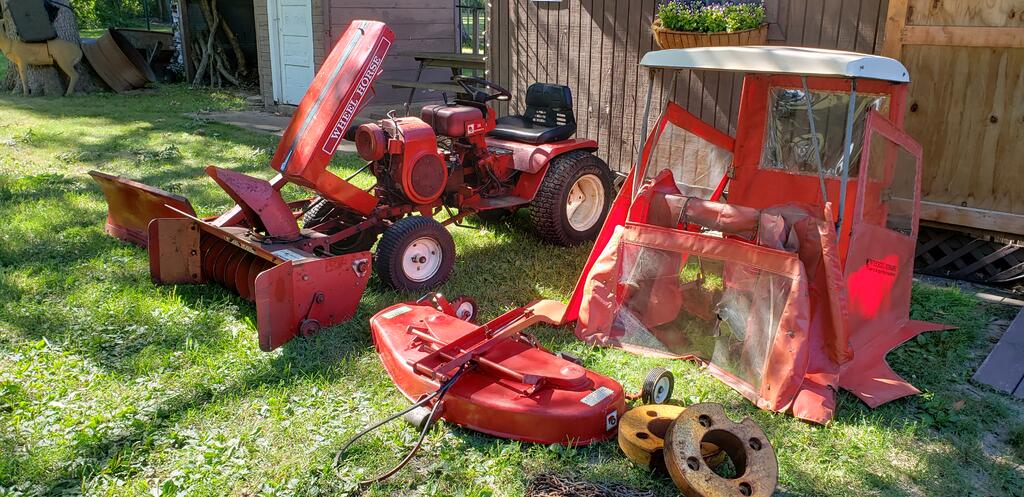 I was planning on restoring this 71 Bronco after I retired.  However, we have decided to move south to be closer to our daughter and I will have no need for the mower/snow thrower there.  My late father purchased this Bronco new in 1971 and we used it mainly for snow removal.  It has been sitting in my shed for several years and has a lot of surface rust, but I am certain anyone with a little skill can get it sanded and repainted to that beautiful Wheel Horse red!  Tires hold air, everything works, even the cigarette lighter.  I do think the carb either needs adjusted, or more likely rebuilt, as it spits and sputters a little.  Everything is original that I am aware of with the exception of a couple nuts and bolts.  I recently replaced the air filter, fuel filter, and changed the oil.  That is the only maintenance I have done.  The enclosure needs a little work on the vinyl (mostly the front piece) and the plastic windshield is cracked.  Other than that, I have all the pieces to the attachments - at least whatever was in my dad's yard barn when I took it out to bring it to my house.  I MAY have overlooked the hubcaps, but I really don't recall ever seeing any on my Bronco. I will look again.