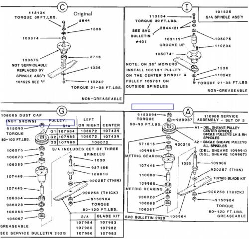 100776 14-1/8" center blade and 100777 12-1/8" left and right blades replaced by 101335 3-blade kit and no longer available from Toro (Hole 5/8in.x3/4in. Double-D)
