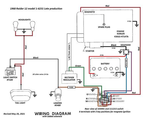 Late production using Kohler K301S-47147b with Bendix starter, 10 amp alternator and magneto ignition with points and condenser Uses (~7572 3-terminal 3-position B-M-S) replaced by 101482 3-terminal 3-position B-M-S ignition switch
