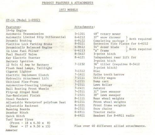 It appears Toro has used the 1970 GT-14 parts list for these 1972 models. Comparing the 1971 IPL to these the following 1970 differences were found.