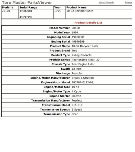 1994 10-32e Rear Engine Rider Recycler model 70100 Serial 4900001-4999999
