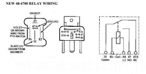 Used as a kill relay on 1981 B-Series tractors with magneto ignition. The battery style ignition switch controls the relay to ground the magneto ignition.