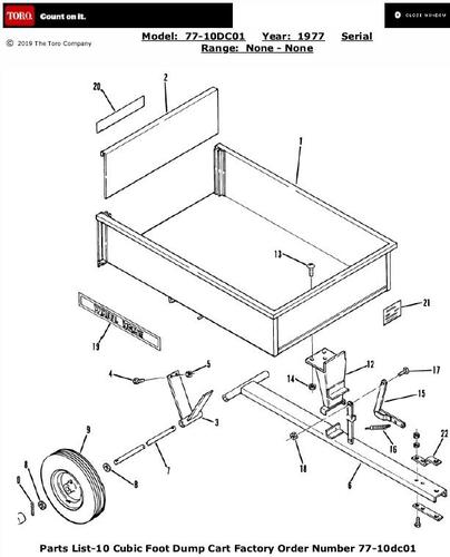 About This File Illustrated parts list from Toro Master Parts Viewer 1 page 110KB Trailer Dump 10 Cu Ft 1977 model 77-10DC01