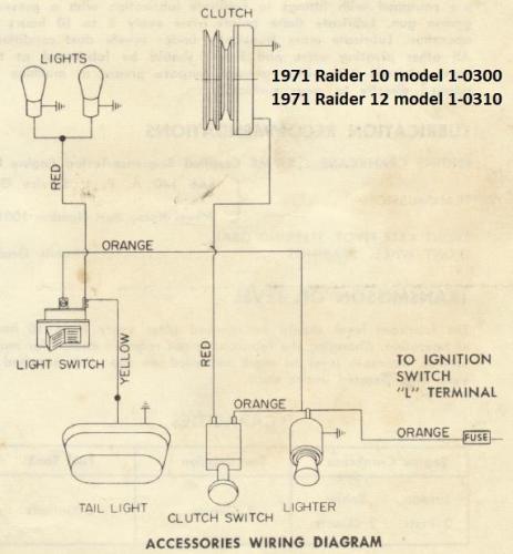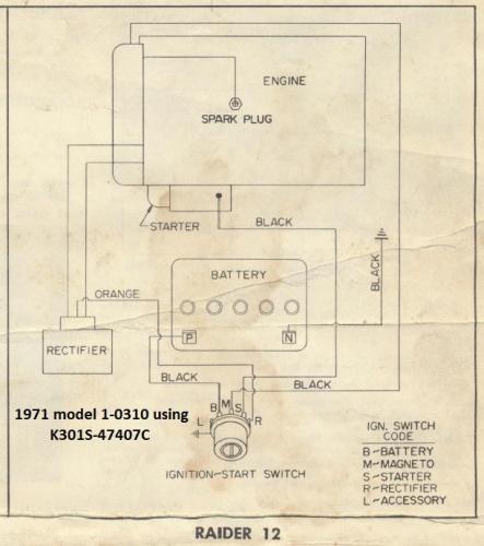 1971 Raider 12 model 1-0310 - (1-0310-6) - Uses K301S-47407C with breakerless magneto ignition (This model also made in Belgium) (Engine oil capacity 2 quarts)