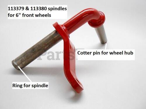 113380 right spindle used 1988-1997 (6" wheel hub retained by cotter pin - Spindle retained by ring)