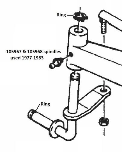 105967 right spindle used 1977-1983 (8" wheel hub retained by ring - Spindle retained by ring)