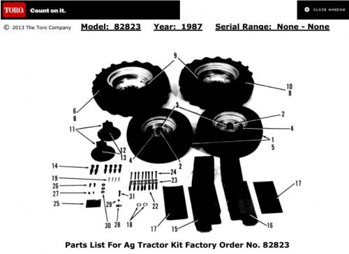 IPL from Toro Master Parts Viewer Ag tractor kit Agricultural tractor kit Possibly intended for the 1987 400-Series tractors 20 x 8.00-10 front wheels and tires used only with this tilling kit 27 x 8.50-15 6-stud rear wheels and ag tires used only with this tilling kit Heavy duty 107124 front wheel bearings as used on HD front spindle kits and 1980-83 E-141 8-speed tractors Rear axle 6-stud hubs 102372 used on D-Series Auto models and C-195 Twin Auto Left and right foot rests used only with this tilling kit Idler plate 111868 used only with this tilling kit Spring anchor 100047 also used on 5-0600 style mower deck for front pto idler pulley tension Eight cotter pins 908026 are not cotter pins but are 5/16"-18 x 2-3/4" bolts so part number must be wrong (8 cotter pins with 16 flat washers and 8 tube spacers shown in the illustration) Eight tube spacers 106574 are also used on B-81 and B-111 4-speed tractors for the pto clutch tension What tractor was this 1987 kit intended for? Tiller 1987 36in model 82823 kit Tiller 1987 36in model 8-2823 kitFree