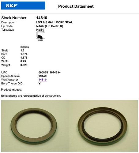 You will notice the Chicago Rawhide / SKF seal spec sheets show a WastWatcher seal. That seal may be easier to find as they have determined it is a part number that will replace many seals with the same dimensions except for width and have characteristics that meet or exceed the seal it replaces. A link to the SKF interchange http://www2.chicago-rawhide.com/popup_parts_lookup_457012.htm Toro / Wheel Horse part numbers are first on each line Seal 47-8030 Use 703333 -- Replaced by Chicago Rawhide / SKF 6105 Seal 56-2820 replaces 56-3270 & 112604 Eaton 1100 input shaft Seal 56-3130 may be -- replaced by Chicago Rawhide / SKF 7465 (Eaton part number ER92999 replaced by SKF / Chicago Rawhide 7465) [Eaton 1100 selector shaft seal] Seal 56-3270 replaced by 56-2820 Eaton 1100 input shaft Seal 83-2830 replaces 1234 -- Replaced by Chicago Rawhide / SKF 7627 Seal 83-2840 replaces 1257, 100573 -- Available only from Toro - This seal mounts over the axle tube - See photo at the top Seal 93-9807 replaces 112822 -- May be Chicago Rawhide / SKF 12407 Seal 253-44 replaces 1117, 108357, 700413, 707984 -- Replaced by Chicago Rawhide / SKF 7443 Seal 1011 -- Replaced by Chicago Rawhide / SKF 9859 Seal 1117 replaced by 253-44 -- Replaced by Chicago Rawhide / SKF 7443 Seal 1213 replaced by 100443 -- Replaced by Chicago Rawhide / SKF 11050 or National 340835 Seal 1232 replaced by 100863, See 114677, 9240 -- Replaced by Chicago Rawhide / SKF 9815 Seal 1234 replaced by 83-2830 -- Replaced by Chicago Rawhide / SKF 7627 or National 471643 Seal 1257 replaced by 83-2840 -- Available only from Toro - This seal mounts over the axle tube - See photo at the top Seal 1303 replaced by 100441 -- Replaced by Chicago Rawhide / SKF 7410 Seal 1447 replaced by 5959 -- Replaced by Chicago Rawhide / SKF 4911 Seal 1461 replaced by 100442 -- Replaced by Chicago Rawhide / SKF 6105 Seal 1482 replaced by 103118 -- Replaced by Chicago Rawhide / SKF 12330 Seal 3373 -- Replaced by Chicago Rawhide / SKF 10035 or National 204005 Seal 5958 replaced by 100607 -- Replaced by Chicago Rawhide / SKF 9878 Seal 5959 replaces 1447 -- Replaced by Chicago Rawhide / SKF 4911 Seal 6449 -- Replaced by Chicago Rawhide / SKF 11124 (Original 6449 is 1/2" wide) Seal 6663 -- Replaced by Chicago Rawhide / SKF 14810 Seal 7877 -- Replaced by Chicago Rawhide / SKF 7475 (Federal Mogul 480821 = CR 7474 , Original seal 9008000-7501 = CR 7443) Seal 7963 -- Replaced by Chicago Rawhide / SKF 6904 Seal 9230 replaced by 703333 -- Replaced by Chicago Rawhide / SKF 6105 Seal 9240 May be same as 1232, 100863 and 114677 -- Replaced by Chicago Rawhide / SKF 9815 a guess. Used on tiller with 5571 bushing Seal 100441 replaces 1303 -- Replaced by Chicago Rawhide / SKF 7410 Seal 100442 replaces 1461 -- Replaced by Chicago Rawhide / SKF 6105 (CR 11050 to replace 100442 @ SKF is wrong) Seal 100443 replaces 1213 -- Replaced by Chicago Rawhide / SKF 11050 or National 340835 Seal 100573 replaced by 83-2840 -- Available only from Toro - This seal mounts over the axle tube - See photo at the top Seal 100607 replaces 5958 -- Replaced by Chicago Rawhide / SKF 9878 Seal 100608 -- Replaced by Chicago Rawhide / SKF 6904 Seal 100863 Replaces 1232, 114677, 9240 -- Replaced by Chicago Rawhide / SKF 9815 a guess. Seal 103103 -- Replaced by Chicago Rawhide / SKF 8620 Seal 103118 replaces 1482 -- Replaced by Chicago Rawhide / SKF 12330 Seal 103269 or 103277 -- Replaced by Chicago Rawhide / SKF 10740 (National 471762 seal for 5-0900 deck thinner than originals) Seal 103461 -- Replaced by Chicago Rawhide / SKF 6763 Seal 106075 -- Replaced by Chicago Rawhide / SKF 9907 (Mower spindle original had double-lip) Seal 108357 replaced by 253-44 -- Replaced by Chicago Rawhide / SKF 7443 Seal 112604 replaced by 56-2820 Eaton 1100 input shaft Seal 112658 may be -- replaced by Chicago Rawhide / SKF 7465 (Eaton part number ER92999 replaced by SKF / Chicago Rawhide 7465) [Eaton 1100 selector shaft seal] Seal 112822 replaced by 93-9807 -- May be Chicago Rawhide / SKF 12407 Seal 114677 replaced by 100863 -- Replaced by Chicago Rawhide / SKF 9815 a guess. Seal 700413 replaced by 253-44 -- Replaced by Chicago Rawhide / SKF 7443 Seal 703333 replaces 9230 & 47-8030 -- Replaced by Chicago Rawhide / SKF 6105 Seal 707984 replaced by 253-44 -- Replaced by Chicago Rawhide / SKF 7443 Seal MW10390 -- Replaced by Chicago Rawhide / SKF 9878 Motorwheel? Used in snowthrower auger drive Seal MW10459 - 3/4" shaft Used in snowthrower auger driveFree