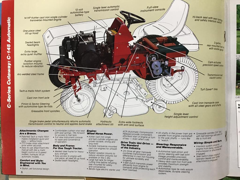 I'm going to pick up the C model next week, he did buy the plow and tiller separately.  It has an aftermarket carb, I guess the original cracked.  My co-worker was going to restore it but instead got a late 70's craftsman from his dad so he wants to do the family tractor.  Only thing that scares me is the Eaton 1100 but I saw rebuild kits and seals are available so as long as I can find a service manual I should be good to go. I will also try to find an original carb.  Mower deck looked good but I will probably have to rebuild the spindles, when I tear it down I will sand blast then take the deck for powder coating.  I plan I striping the tractor then painting with an automotive base coat/clear for durability unless that's not a good idea.  Like I said I plan on using it.  I was looking for one of these or a 80's gravley tractor.  Of course my wife isn't too happy because its "old" but I would rather spend 1-2 grand restoring and using one of these over a new tractor that costs 7 grand and has all these crazy safeties and electronics.