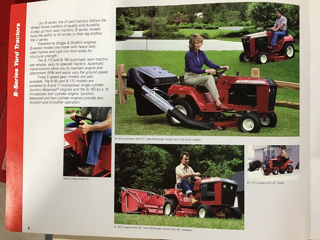 The "B" series has a Brigs and Stratton engine and if it is a manual transmission it would be a Peerless unit rather than a Uni-drive which is much stronger. "B" Wheel Horses are are fine for light duty residential use but I have a preference for the Kohler engine and Eaton 1100 hydrostatic transmission the "C" series has. That missing panel is strictly cosmetic.