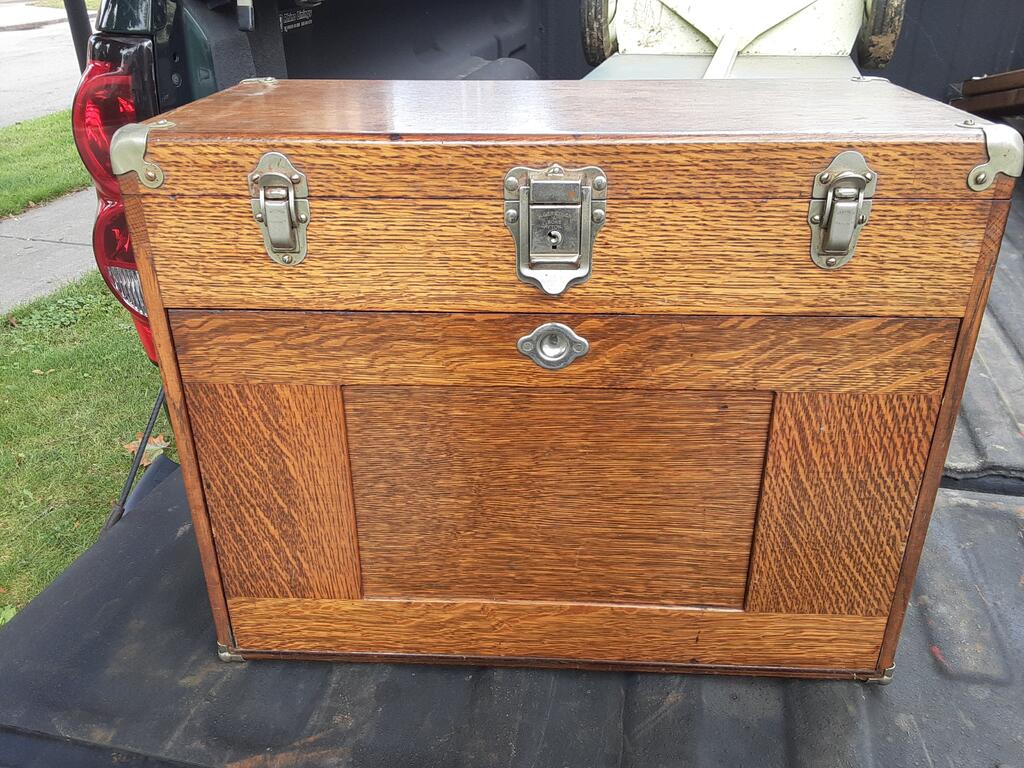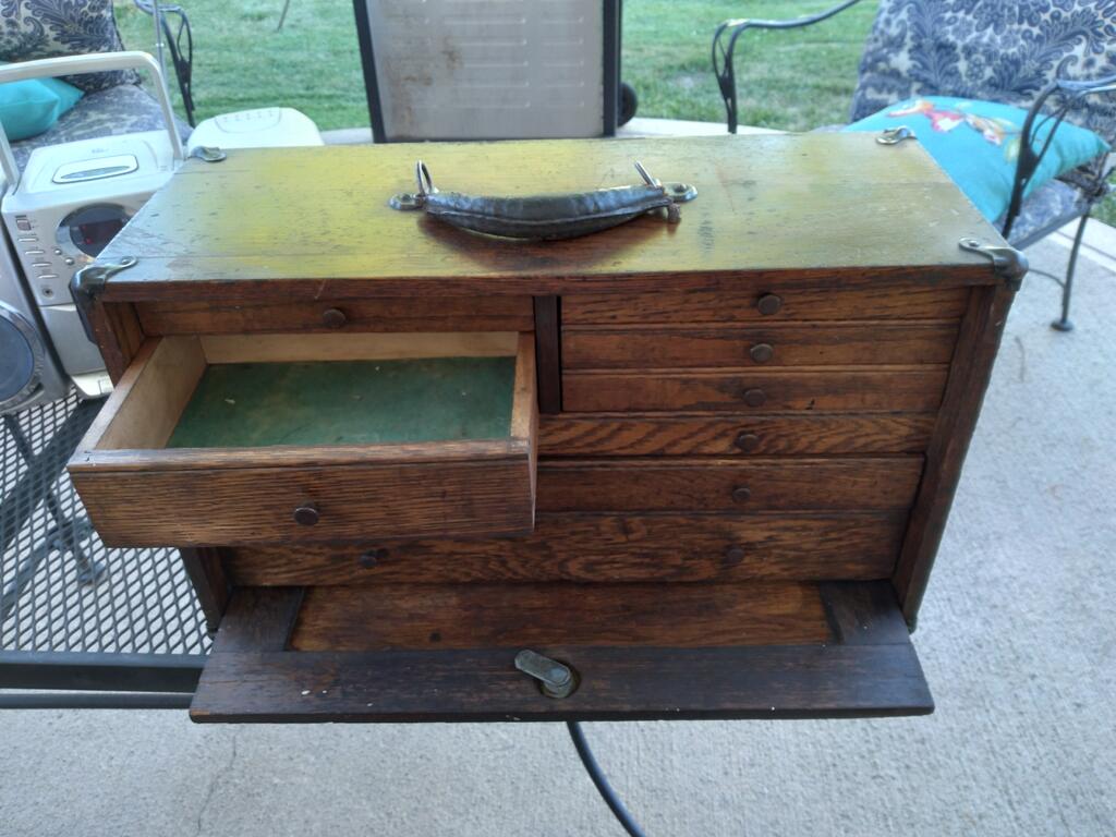 formariz 12,352 #1 Posted December 22, 2023 I was offered this vintage machinists tool box by @Handy Don who was kind enough to even bring it to me. It is from the 50s. It was missing two drawers and at some time in its life it was exposed to water. Some veneer in back had delaminated and broken off. As soon as he offered it I knew right away its future function. My oldest son has given similar machinists boxes , but in metal to each one of the boys. So I am giving this one to my granddaughter. She can keep her little stuff in it and it can also be a future jewelry box. It’s Union Tool Chest model B20 from 1950. It is stamped on the interior with number 394 which I am sure it’s the serial #. Made two new drawers and repaired veneer. Also lined all the drawers with new felt this time lining the entire inside surface of drawers . Removed the old damaged finish , restained it and applied some wipe on poly . Finally cleaned and reinstalled all hardware. Even found a reproduction factory tag for it. I just need to find two correct little pulls for new drawers. Rather than being discarded it now will have a new life and purpose for at least another generation. Thank you @Handy Don Before After Before After 2 16 4 Share this post Link to post Share on other sites