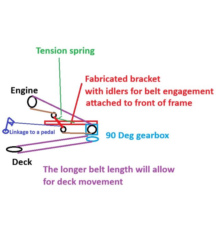 953 nut 62,195 #4 Posted September 24 That is a fine looking 702. As you have said, mounting that mower deck to your Wheel Horse would involve a couple of alterations, you would need a "Mule Drive" to transition your drive belt from vertical to horizontal (see drawing below). The other change would be having a PTO (Power Take Off) clutch on the engine and the engine pulley the clutch plate bolts to as well as the fabrication to add these. All of the parts and pieces to do this are readily available here in the states but may be hard to come by down under. I guess you could improvise with a right angle drive gear box and an electric clutch. Good luck with your project and let us know how you are doing with it. 1 1 Share this post Link to post Share on other sites