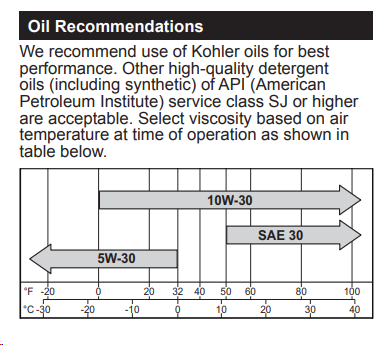 lynnmor 8,077 #14 Posted 5 hours ago SAE 30 detergent oil above 32 degrees, 10W-30 below. I use Kohler oil since all automotive oils have been altered to suit the emissions control parts. 1 Share this post Link to post Share on other sites