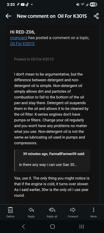 RED-Z06 2,680 #15 Posted 4 hours ago 17 hours ago, FarmallFarmer09 said: Bought it this year. google says sae-30 SHOULD NOT be used. Maybe i need to stop trusting everything on the internet lol. Thank you SAE30HD would be fine, but Non-Detergent oil is meant for Power Washer Pumps, Compressor Pumps...its a quick way to kill a gasoline engine because the lack of detergents causes the oil to break down and sludge up Share this post Link to post Share on other sites