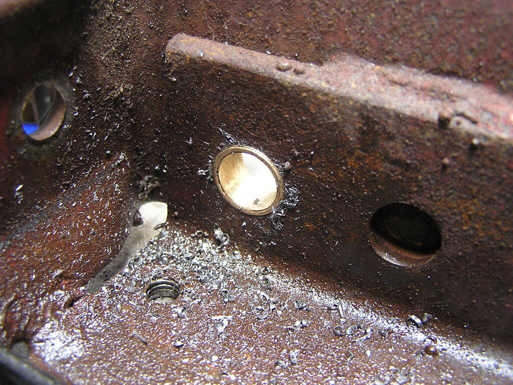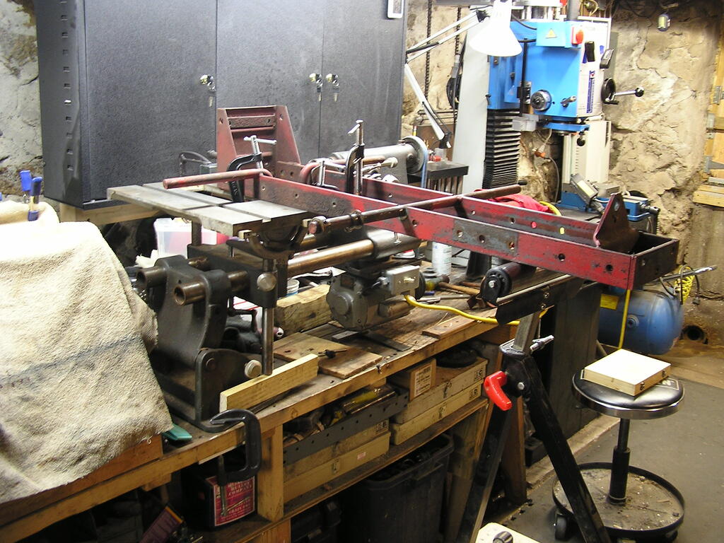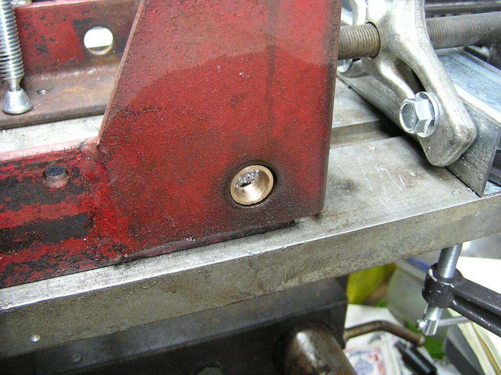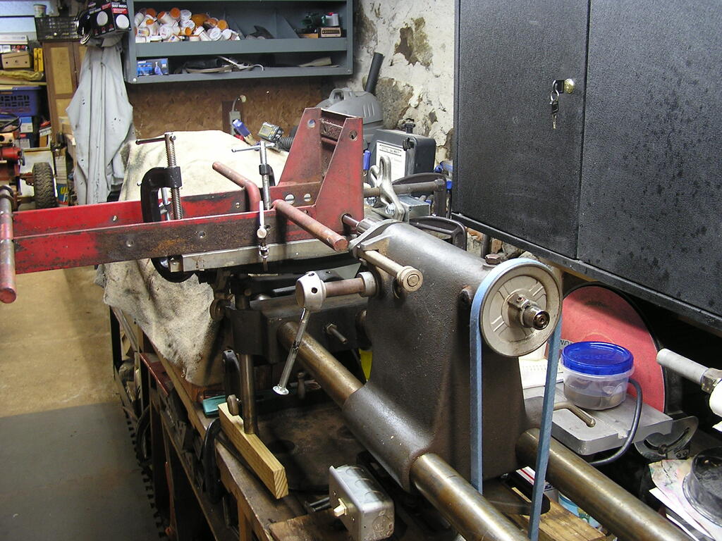 ri702bill 10,594 #1 Posted 7 hours ago There was a fair amount of wear on the ends of the C81 Clutch Shaft where it goes thru the frame. Metal on metal, no bearings & not easily lubricated. I installed the bronze bushings on the 502 frame a while back, using the milling machine. The C Series has two sets of welded 3/4" diameter rods to hold the foot rests, the rear ones were in the way - could not do this in the milling machine. There were 3 choices - cut the rear rods off & reweld them later, do the work by hand, or - break out the 1950's ShopSmith 10E and use it. I went with option #3 - while the assembly & setup are extensive, it gives the best results. Pictures are for the RH bearing: the setup needs to come apart and be reassembled opposite hand to do the left. 7 Share this post Link to post Share on other sites