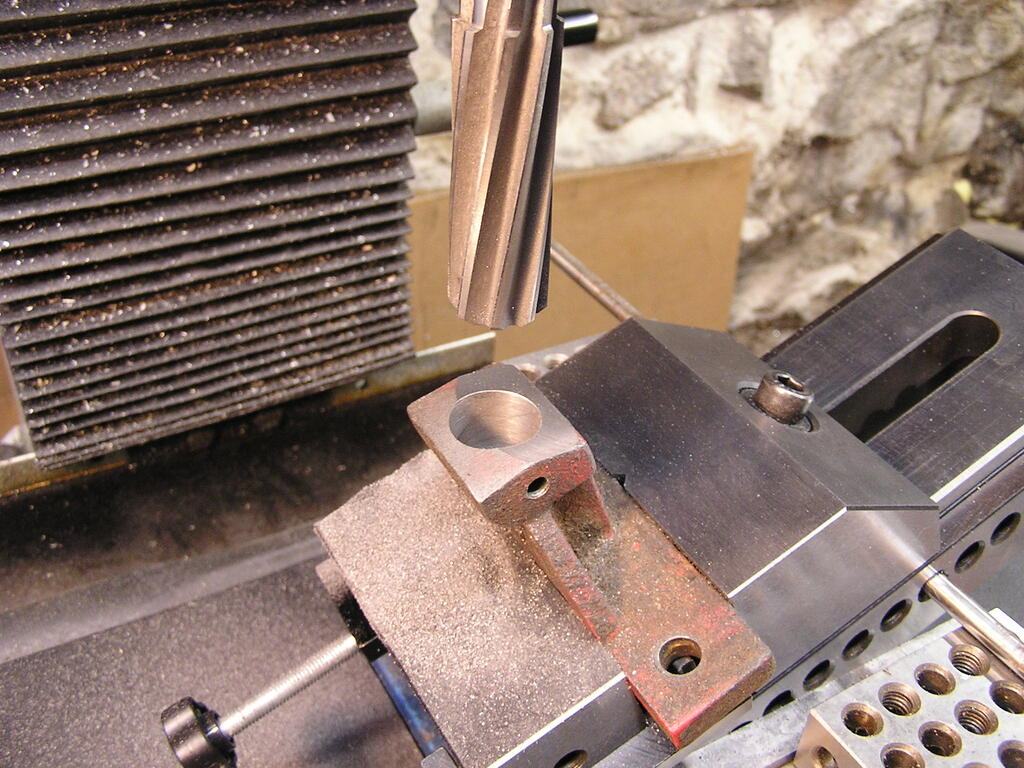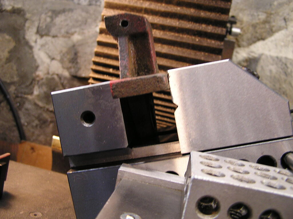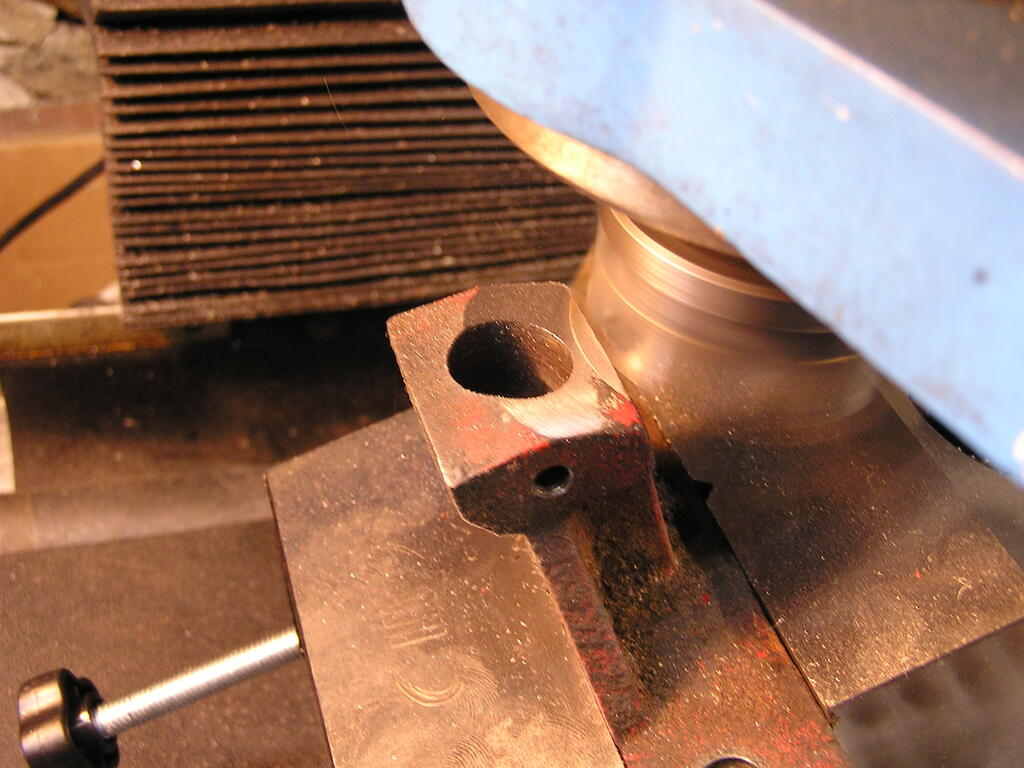 ri702bill 10,901 #6 Posted yesterday at 12:27 AM OK. I bought a 4" Screwless Toolmaker's Vise - finish ground on all surfaces. I mount this vise at an angle in the 5" Milling Machine vise. There ate thru-holes down the entire side - used a 3/8 rod to help set the angle, along with a 3/4" diameter steel dowel in the quill to line up the hole. Narrow C clamps hold the lower part of the casting firmly up against the non-movable back jaw. Vise comes with vertical and horizontal V grooves for round stock work too. Fly cut the top to clean, bored & reamed for the bushing. Drilled thru the bushing wall at the grease fitting. Last step, not shown, I drill & tap the lower bushing hole for a grease fitting too. 1 Share this post Link to post Share on other sites
