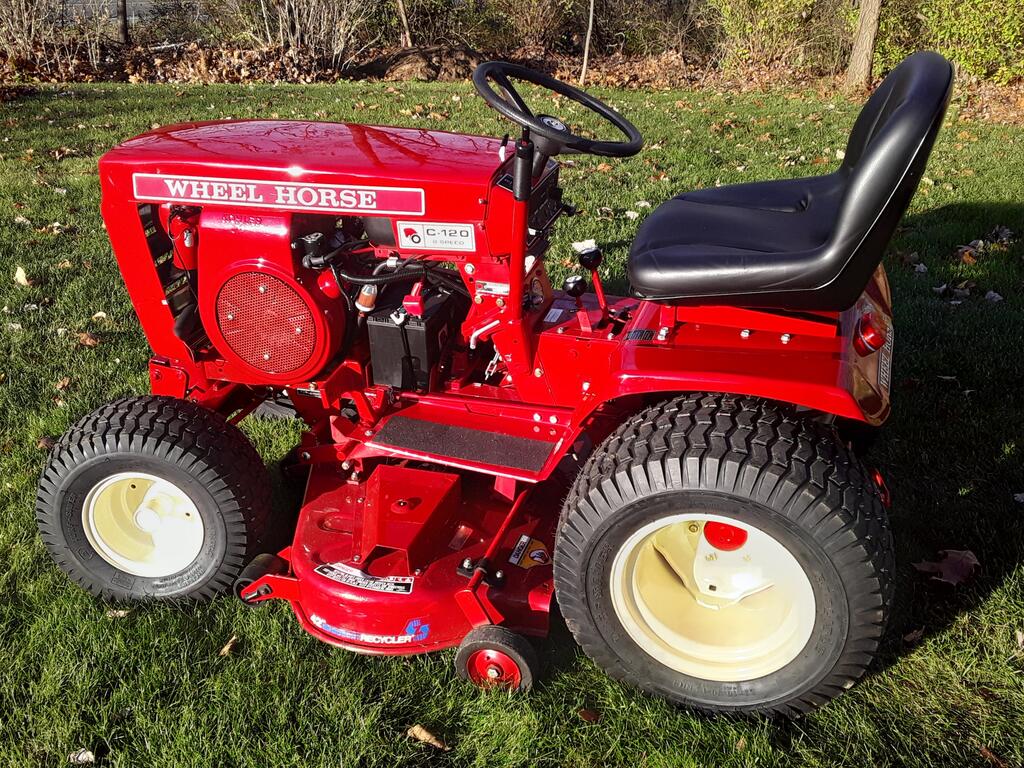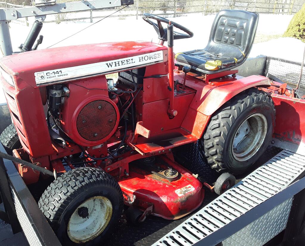 76c12091520h 4,100 #1 Posted 6 hours ago (edited) This is a long story so bear with; Dad was a Wheel Horse dealer. My moms uncle was also a Wheel Horse dealer from the 60's thru the 90's. My dad has only owned 3 Horses all these years: a 701 , a C141, and his only new Horse- a 416H. In 1978 moms uncle sold a new C141 to my grandparents neighbor. He stored it in my grandfathers barn but he died in 1980. My father sold our 701 and purchased the like new C141 for our own personal use. I had the majority of the seat time as mowing the grass was my job. We kept the C141 until 1993 when it was sold and dad took a new 416 for his own use. The C141 was sold somewhat locally and dad took a really ragged C120 on trade for it. Dad gave me the C120 which I totally restored and has been my everyday tractor since 1996. Fast forward to this week. I scroll the local Facebook marketplace listings several times a day and saw a C141 listed about an hour away and gave it no thought whatsoever because I am not looking for anything other than parts tractors. Looked at the listing another day or so later and for some reason looked closer: there were 2 things that gave it away : when we got it back in 1980 there were holes punched in the muffler ( God only knows why ) which Dad brazed shut, and there was a faded, worn decal on the left rear top of the hood. A few carefully asked questions and a rode trip was in order. It's had a rough life and multiple owners ,but our old C141 came home today after 33 years. Sold new by moms uncle, dads tractor for most of my life that was spent at home, and I own the tractor that was traded in on it. Needless to say it's going to get a full restoration and it's not going anywhere again. Edited 6 hours ago by 76c12091520h 2 14 5 Share this post Link to post Share on other sites