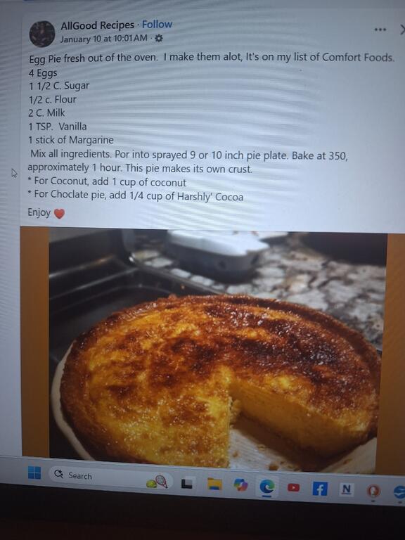 Beap52 2,136 #4 Posted 3 hours ago (edited) That rhubarb and blackberry pie looks like a keeper. I have never heard of rhubarb custard. Might be something to look into. Many moons ago our church had a men's bake off. Whereas most of the men baked cakes, but I made a fresh pumpkin pie. (Canned pumpkin is too purified- no texture.) Some folks asked me, a carpenter, about making the pie. I replied "I figure if I could build a house, I could certainly build a pie." Couple of weeks ago I made the pie pictured below. It's a custard type pie, super easy to make and you don't even need a crust as it kind of makes it's own crust. I threw in coconut and cut back on the sugar. For me, it was one of those pies that every time you pass through the kitchen, you've got to keep a fork in the pie dish and take at least two bites. Wife wasn't willing to take a bite so it was all mine. (I hope I'm not breaking some law by posting the original picture and recipe that I found on the internet somewhere.) Edited 40 minutes ago by Beap52 clarification 1 1 Share this post Link to post Share on other sites