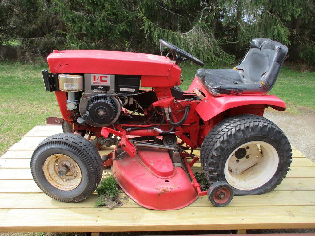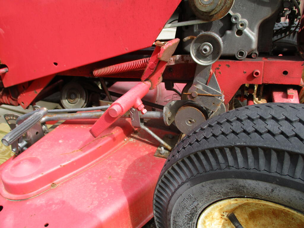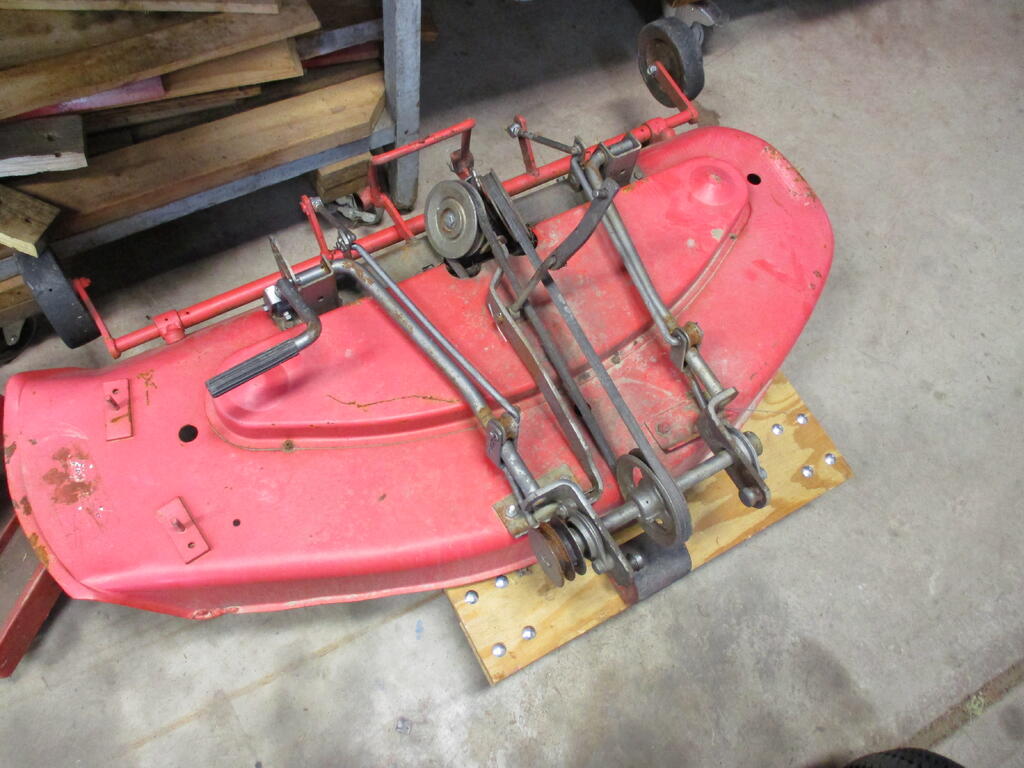 pfrederi 20,292 #1 Posted 5 hours ago Unexpectedly won this horse at auction a couple weeks age just got her home. It was in the non running section but I saw the hydro lift and figured parts for that alone would be worth something but figured someone else would see that also. They didn't and I won. $60. Hydro gear plus lift I figured it was hacked up Charger Electro. Turn out it is a short frame1965-77 Wheelamatic. But I don't believe hydro lift was even an option for those. Then there is the deck. I have never seen one like this before. It is I believe a complete and in good shape RM425 a 42 inch deck for short frames. The mechanism looks rube goldberg but based on a picture I saw seems to be complete. When I thought it was a long frame, I had a K301 I would put in it and if the hydro worked sell it. But she really needs a small base big block S/G which I don't have. 5 5 Share this post Link to post Share on other sites