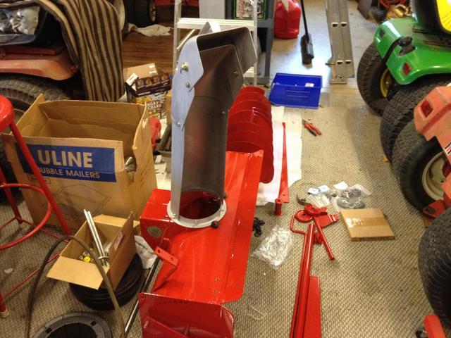 Martin 2,133 #35 Posted November 18, 2014 (edited) chute fabrication was on the agenda today. i used a 20 x 16 piece of mild steel sheet roughly the same thickness as the Ariens pieces and formed a bottom section out of it. one end needed to be 8 inches diameter to fit the rotating collar that sits on the blower shell. the upper pieces are 6-7 inch diameter so i had to reduce the size on the other end of the fabricated section to that so it would fit them properly. the chute stands 30" high, i have no idea what the height of a wheel horse tall chute measures, but this one is about where i thought it should be. its a little higher than the 1057 hood sitting next to it (covered up), but as yet not sure how it will look on the 416 that its probably going to be attached to.... the pieces are just bolted together right now, the bottom section where it attaches to the collar will get welded before painting so the bolt heads don't interfere with rotation.... so those of you that have tall chutes, could somebody measure the length of the chute from the rotating collar to the top of it. id be interested to see what a oem one measures..... Edited November 18, 2014 by Martin 5 Share this post Link to post Share on other sites