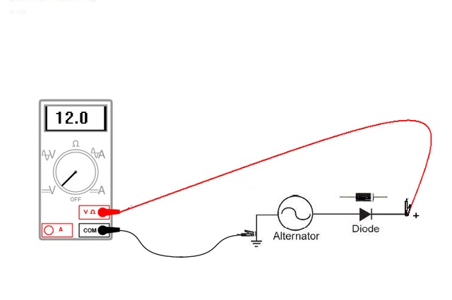 At the diode, you should be reading DC voltage for charging if you have the (-) meter lead attached to ground, and the other to the diode end of the wire.