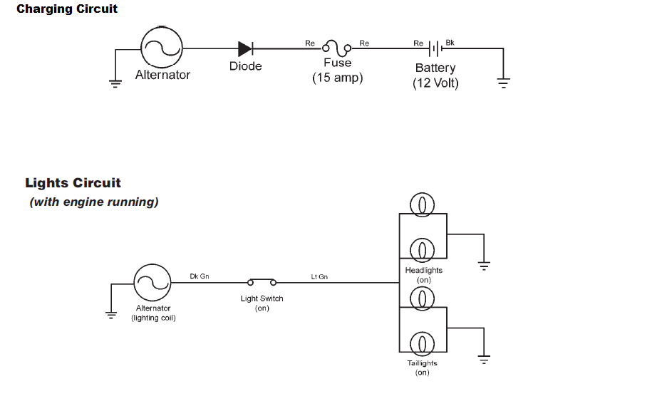 thank you for the reply my system is the 3 amp non regulated stator has 2 wires on it 1 goes to headlight switch the other one with diode goes to ignition switch i do not have a regulator/rectifier or hour meter or amp meter i have the idiot lights and low oil switch. I looked at wiring diagram for it thats how i figured out which system i have. mine has the 5amp fuse and 15 amp fuse volt meter is working after i replaced with an auto meter one i had laying around had to replace the 5 amp fuse also 15 amp fuse is working also i checked that i'm going by the wiring diagram out of owners manual i printed off. everything corresponds to it i guess my question is there anything (safety switches etc.) that would cause me not to get any voltage from stator wire with diode in it