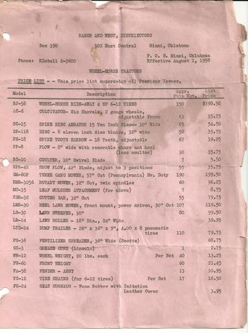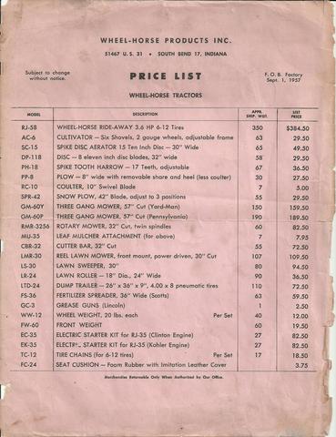 Here are two price lists from a dealer with the Wheel Horse company official prices for 1957 and 1958 tractors and attachments.