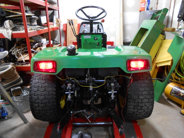 fireman 1,022 #29 Posted October 4, 2015 So after not running the tractor in like 4 months and putting on the new throttle and choke cables I rolled it outside and it fired right up with no adjustment of the cables needed.Let it run for a little while and drove it around a little then over into the workshop. I installed the spacers that came with the rear hydro outlet kit that lifts the rear of the seat pan allowing access to the connectors. I set the seat pan in place and tried the bolts to make sure everything lined up. Then I added the new decals, anti skid foot mats and installed the light bezels with new L.E.D. lights. Slipped the hood on and rolled it outside to take some pictures. The green looks a little lighter then I would have liked but oh well. I have to keep reminding myself this is a worker and not a show tractor! I'm going to replace the fuel lines and pick ups before I permanently install the seat pan. Still need a new headlight lens and 3 new L.E.D. bulbs for the headlights. Also need to replace my seat and tires. The seat is cracked really bad plus I want armrests. Now just to finish this up and move on to the cab. 3 Share this post Link to post Share on other sites
