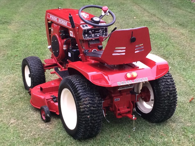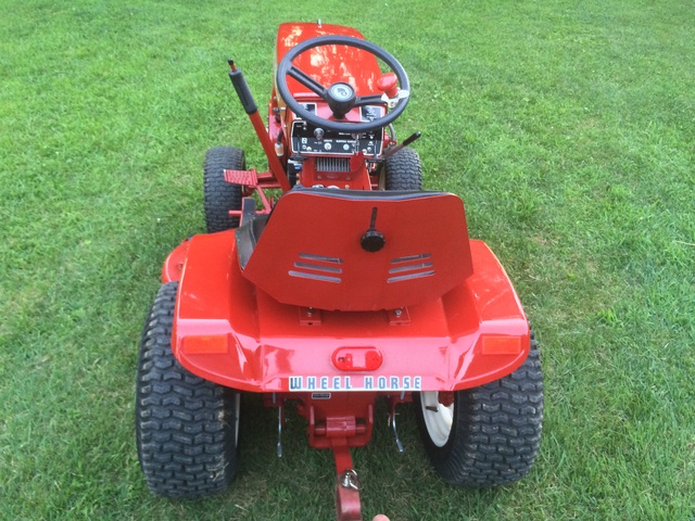 Original Restore of my 1973 model # 1-0365 Wheel Horse 10HP 8-Speed Lawn & Garden Tractor, original Kohler K241S engine, spec 46636D was rebuilt, upgraded the original side-discharge deck for a 1976 model 65-42MR01 42" Rear-Discharge Mower Deck, upgraded the plain front plastic placard with a model 8-0814 "Light Panel Assembly" (Head & Tail Lights) dealer kit, upgraded the original "low-boy" seat to the more comfortable 1974 stock "C-Series" seat, and a completely re-manufactured wiring harness.