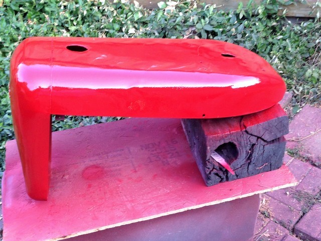 Lane Ranger 11,680 #212 Posted August 9, 2016 (edited) Ok Red Square , the RJ rebuild is now is operation again. I have been awaiting my RJ hood with new gas straps welded on . My welder had a job do do away from our county and could not get to my hood until recently. I have a new gas tank for the Rj(that has the neck further back on the tank) so my new gas tank straps had to be adjusted to fit the tank. The hood had lots of issues with old holes be welded up with brass brazing, bondo, glazing compound and lots of sanding. I have finished painting and sanding two coats of Regal Red. Not letting dry a couple days before I install the gas tank and place the hood on the frame. Today I installed the rear hitch and hitch pin on the RJ (thanks to Jake Kuhn for the hitch), the lift cable (a new one from Lowell S./wheelhorse1000), the chrome Harley Davidson Softail heat shield I plan on using ( I added some aluminum diamond plate in a few places as the fender pan/tool box had some serious holes in it). I also started working on the steering block set up and painted the steering wheel column. Stevasaurus and Racinbob have been tremendous to work with on getting me this far! I still have a transmission project to complete after this redo! Here are a few pictures for an update. I did get a little more work done on the gas tank hole on the hood before painting it! New Old Stock gas tank ready to paint! The Harley Davidson Softail Heat Shield fits nicely on the exhaust pipe of the RJ and has two holes from broom clamps in the right spots. The steering block with a new steering pin. New E rings are installed on the pin holding the rear slot hitch in place. Edited August 9, 2016 by Lane Ranger 3 Share this post Link to post Share on other sites