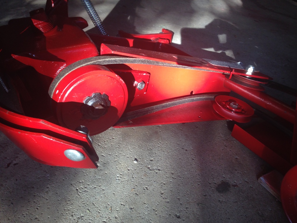 Lane Ranger 11,678 #20 Posted April 23, 2017 (edited) I don't have exact measurements for the U Shaped or C shaped part that mounts in between the plate of Wheel Horse at the rear transmission end. But my U shaped piece bolts in with 3/4 inch bolts and rests inside the [late holes at the back. The width of my U or C shaped piece is 6 5/8 on outside. The length of the tabs on each end are 2 1/2 inchs ( this is where the holes for the 3/4 inch bolts are drilled thru the U/C shaped bar. Karl: The steel thickness is 1/2 inch Not 1/4 - pretty heavy duty. Mal lMac: I agree about the speed of the wobble box being a concern. The real weakness of the Wheel Horse sickle design is the wobble box. The way the parts come together in that box, the bearings, the oil seals and the 30 weight oil used to lubricate complicates speed and length of use from overheating with friction. I know on the Haban sickles used on garden tractors the Cutting Speed can go between 900 to 1200 strokes in one minute! Haban has a 90 degree sealed gearbox and a drive shaft with yokes underneath the tractor frame and runs blade off of a dual pulley system and jackshaft. Thus spreading out the functions done in the single Wheel Horse wobble box. Haban also has a breakaway stem that pushes bar back, can go 45 degrees below horizon cutting ( and althougt I would not try it -it can cut hedges along their side at 90 degrees up also) Karl: This is a photo of how my Haban Sickle Bar Mower is run off the PTO on a B-80 Wheel Horse. Extra pulley on left side was added for adjusting tension of belt. Also I agree that Denny Clarke is the man to go to to get the best rebuild information! He is much more patient and thorough than I am ! The three plates shown in the above photo is how you adjust the tension on the two Haban sickle bar mower V belts. The carriage bolt nuts of loosened on one side and a full sized bolt is tightened up against a side plate to pull the plate and V belt toward you. Then tighten the carriage bolt nuts to proper tension. About 1/2 to touch much like Wheel Horse Mule Drive tention for a mower deck V belt. Edited April 23, 2017 by Lane Ranger 2 Share this post Link to post Share on other sites