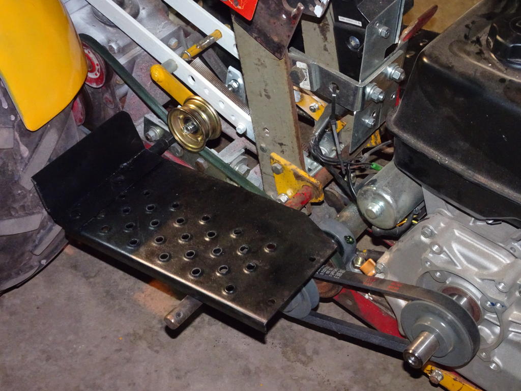 I'm using the spring loaded idler pulley because the belt is too long. Before buying another belt, I tried wallfish's schematics but with the idler pulley.... it failed. See photos. Desperate to ride I stopped the belt with my shoe and found first to be very fast at idle plus. But third at the same rpms bogged down and stopped the engine. The foot brake is effective but before the next test, a better one will be installed and I will also explore a kill switch.