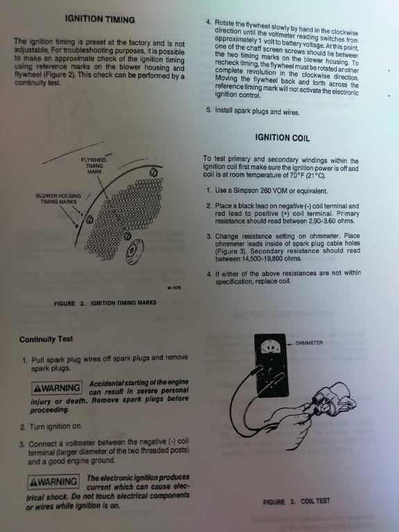 TC10284 113 #10 Posted October 6, 2018 On 10/4/2018 at 9:18 PM, WVHillbilly520H said: I like the inline spark testers... https://www.harborfreight.com/in-line-spark-checker-63590.html...here's some pages from the Onan manual I tested the coil using the method in your pictures. I got 3.5 ohm on the primary wires. On the secondary set, I get infinity. So I'm guessing this coil is bad. To confirm, I tried another voltmeter. And went even further by connecting the plug wires to the coil to make sure I was making contact with the coil and that my voltmeter terminals weren't too short. Guess I'll be ordering another coil. 1 Share this post Link to post Share on other sites