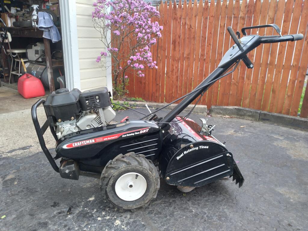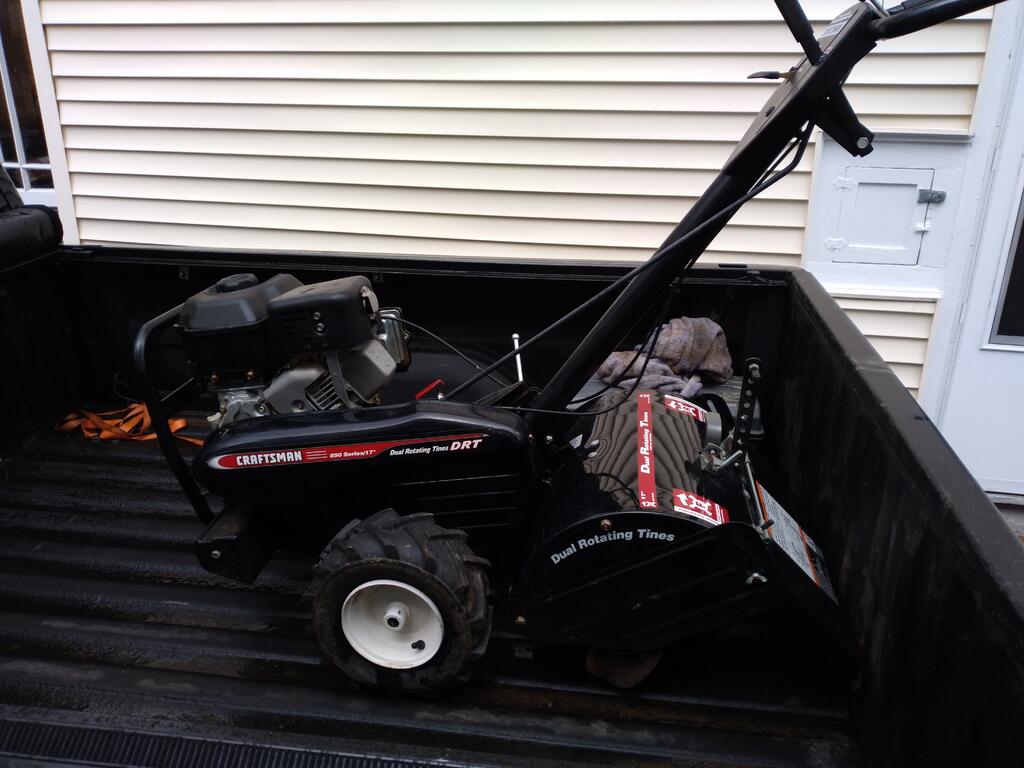 D_Mac 9,330 #1 Posted April 20, 2021 (edited) So I picked this up today for free !! Craftsman DRT 8.5 hp 17 inch tiller. When I picked it up I asked previous owner what was wrong with it. He said he couldn't remember but thought it was something to do with the tiller not spinning, he wasn't sure. Well I took it home and hosed it off while it was still in the back of my truck. After that pulled the air filter off and gave it a squirt and a pull and it fired right up. Have to leave it on half choke or it would stall out but at half choke ran smooth as can be. Then stupidity raised its head when I shifted it gear, reverse, and as soon as I put it in gear it was off to the races. Being that I had it on my tailgate that wasn't a good thing. I was able to stop it and avoided it falling or me getting hurt. Got the ramps out and rolled it down. It has a grab bar that is supposed to engage it when grabbed. I didn't grab it in the truck it just took off. So I seen that on the end of the cable it wasn't moving when grab bar was squeezed. Took the belt cover off and seen that the idler pulley was stuck behind the back side of the belt cover. Removed the pulley to free it up, took a zip tie to hold back the back side of belt cover. Put the front side cover back on and boom everything now works as it should. Going to change the oil and clean the carb. I think it was only used once or twice. Its in great shape. Gonna flip it and get some money for a horse. Wheel Horse of course !! Edited April 20, 2021 by D_Mac 3 Share this post Link to post Share on other sites