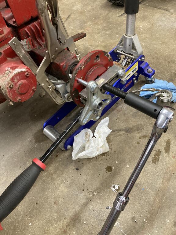 squonk 44,860 #2 Posted May 11, 2021 5 7/16" fine thread bolts threaded into the hub. Backed up with washers and 7/16" fine nuts. (not shown) 1/2" plate with 2 heavy 7/8" fine thread nuts welded together and welded to the plate. HD 7/8" fine thread threaded rod with another heavy nut welded to the end. Fine thread screw gives more strength and pulling power. Extreme pressure grease on the threads. 8 5 Share this post Link to post Share on other sites