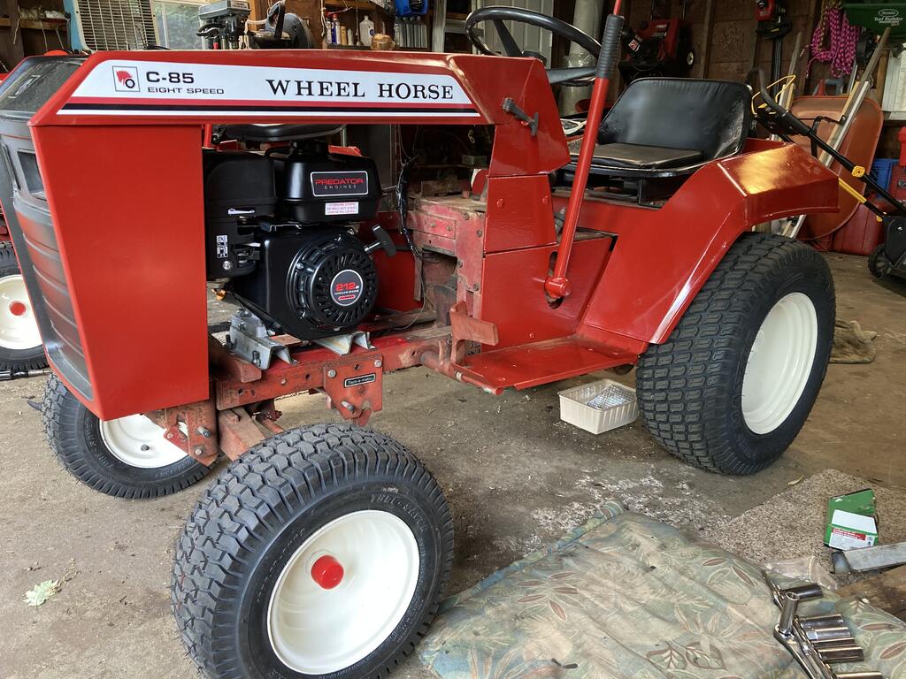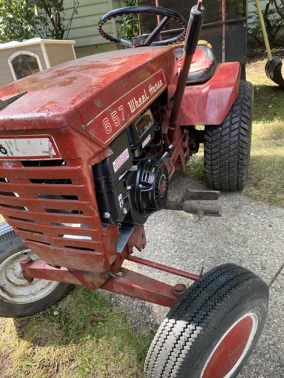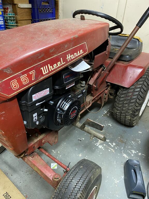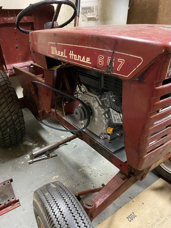 This is my first born custom and is still under construction. Only one of the hoods, gutted frame, seat tray and seat are from my recently acquired 551 Suburban. A newer 3 speed transaxle and belt guard will round out the remaining Wheel Horse parts. The front axle is flipped and moved forward 6 inches. Its origin along with the tie rods and steering column comes from a 102 Cub Cadet. Taking 2 steps back for every advance is part of the fun. But now I'm at a loss and overwhelmed at all the V drive pulleys available at Phoenix pulleys. Can anyone suggest what pulley I should use with the 13 hp Predator? Thanks in advance